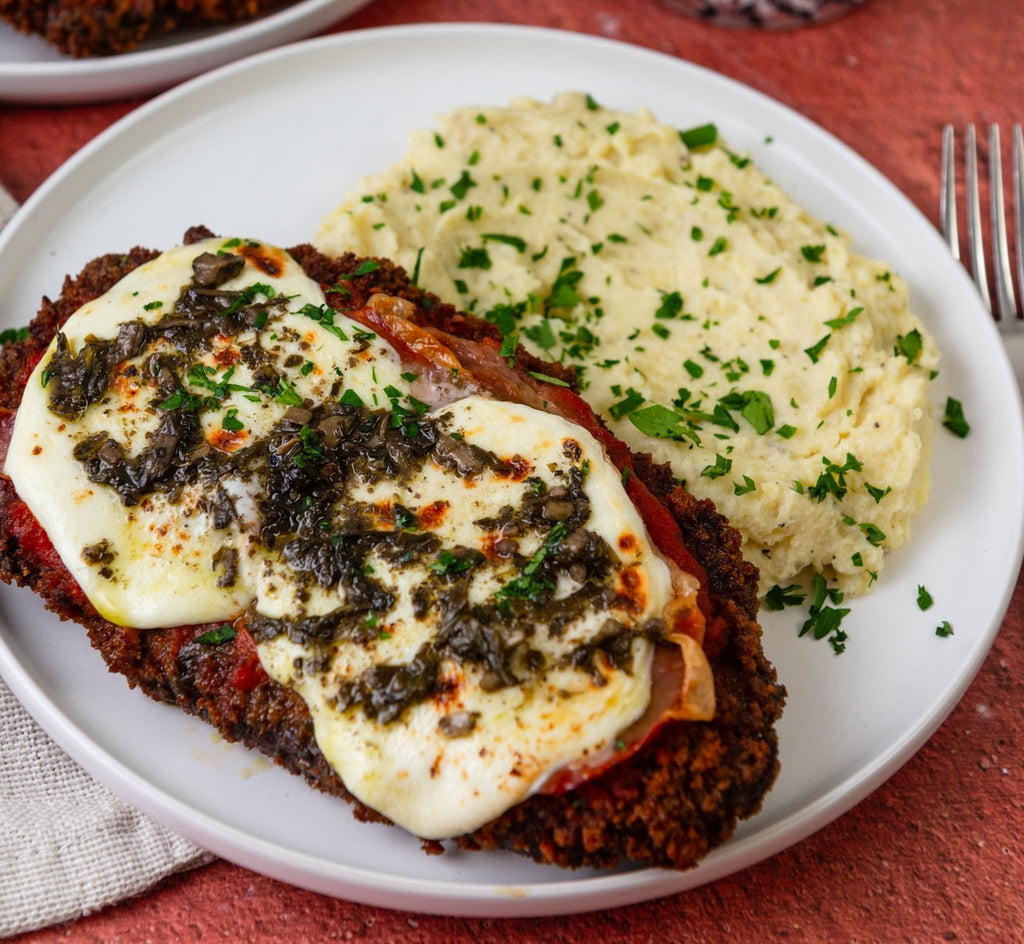 Finish & Serve: Top each cutlet with 1 tablespoon of basil spread and garnish with chopped parsley. Serve hot, with mashed potatoes or your favorite side.